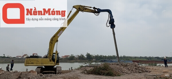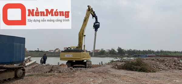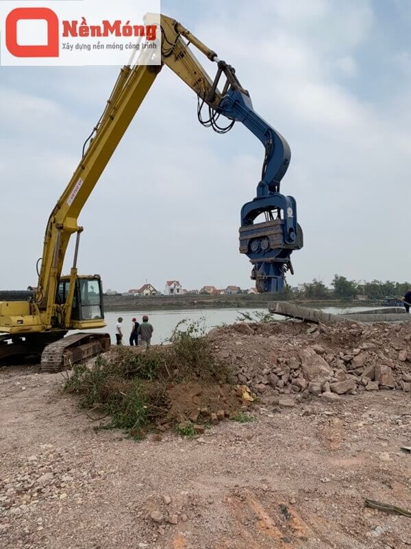 Xây dựng nền móng đã thực hiện dự án cầu cảng thị xã Chí Linh, tỉnh Hải Dương với hạng mục ép cọc bê tông bằng búa đóng cọc gắn trên máy xúc.